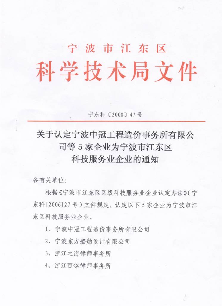 关于认定宁波中冠工程造价事务所有限公司等5家企业为宁波市江东区科技服务业企业的通知-中冠新闻-中冠咨询-ob欧宝官网首页中国有限公司