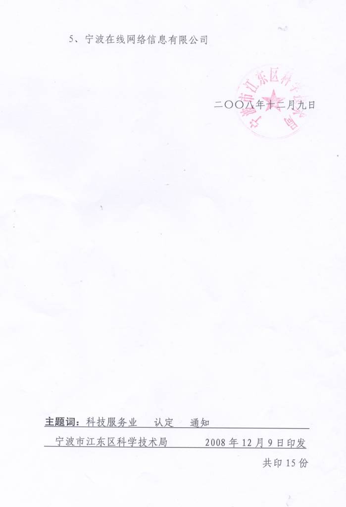 关于认定宁波中冠工程造价事务所有限公司等5家企业为宁波市江东区科技服务业企业的通知