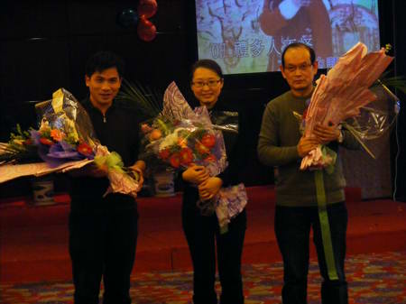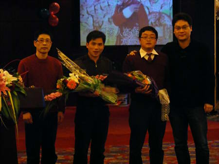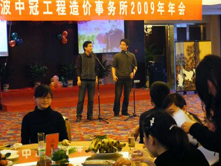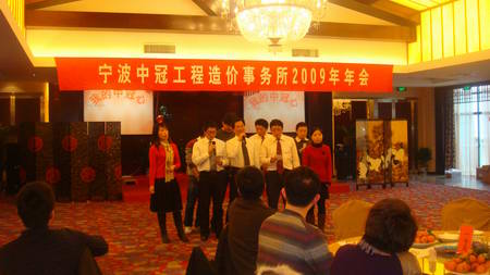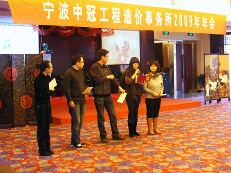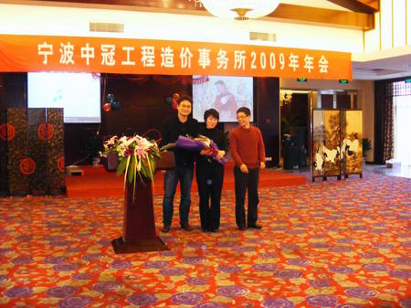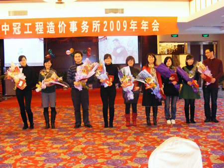 大会于下午14:30正式开始。首先进行的是2009年度优秀个人表彰大会,本次表彰大会共表彰了4个奖项,分别为9名优秀员工(周巍、陈黎、谢刚、姚兰、余春幼、周幼辉、王佳、陈瑾、徐平)、1名浙江省造价协会授予的优秀个人(谢慧敏)、2名2009年宁波市造价协会评选的优秀造价师(任福成、杨祖迪)和江北区审计局授予的2009年度优秀协审组(任福成、林松、刘旱味、王晖等)。在全体员工热烈的祝贺掌声中,公司领导和各部门主任一起为表彰人员颁发证书、奖金和鲜花。