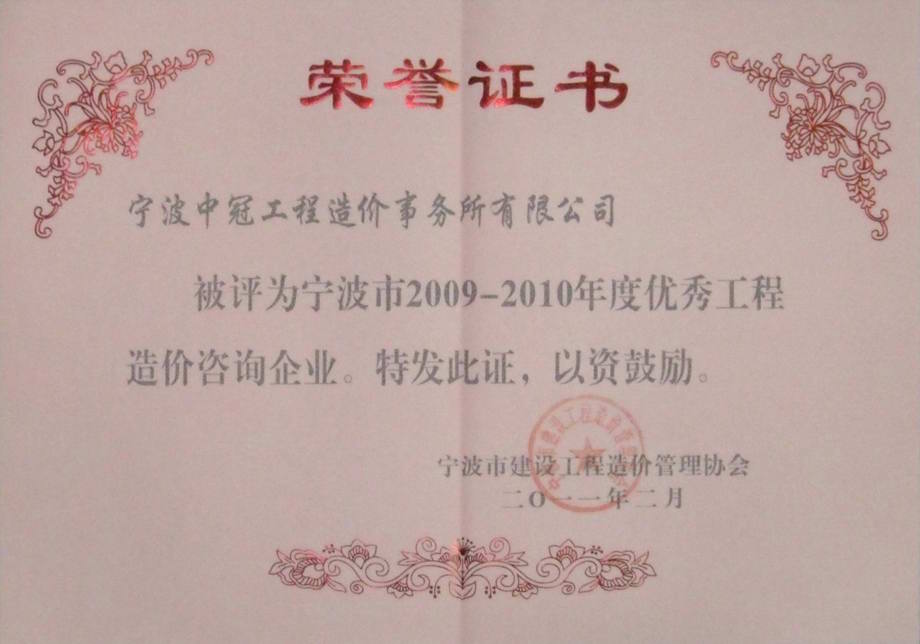 我司被评为宁波市2009-2010年度优秀工程造价咨询企业-中冠新闻-中冠咨询-ob欧宝官网首页中国有限公司