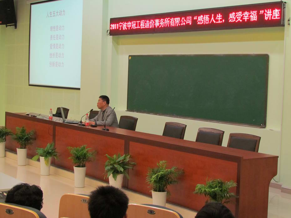 4月8日晚上,我司举办“感悟人生 感受幸福”专题讲座。讲座邀请了中共宁波市委党校行政管理教研室主任张荣昌教授进行了专题讲授。公司全体员工聆听了此次讲座。 会上,张教授以“感悟人生,感受幸福”为主题,从感悟时代特征、感悟人生境界的理论,同时从社会公德、职业道德、个人品德、家庭美德等方面了分析了幸福观及人生价值取向问题。 通过张教授的讲解,增进了大家对于自身的了解,进一步激发了员工的工作热情,为更好地规划自己将来的职业生涯起到了积极地作用。 2011.4.16