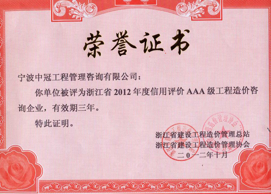 根据《关于开展浙江省2012年度工程造价咨询企业信用评价工作的通知》精神,浙江省建设工程造价管理总站和浙江省建设工程造价管理协会组织开展了2012年度工程造价咨询企业信用评价工作,经信用等级评价领导小组研究审定,确定了168家AAA工程造价咨询企业,99家AA工程造价咨询企业。中冠公司荣获“AAA工程造价咨询企业”,公司副总经理陈勇到会参加,并在会上接受了颁发的证书。 二0一二年十一月十五日