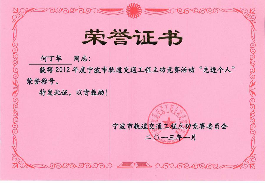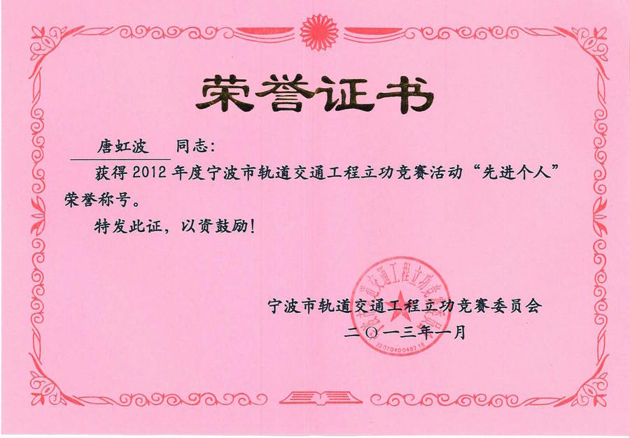 2013年1月喜讯传来,由宁波市轨道交通工程立功竞赛委员会授予中冠公司“2012年度宁波市轨道交通工程立功竞赛先进集体”,公司唐虹波、何丁华两位同志授予“先进个人”荣誉称号。 公司办公室 二0一三年一月二十三日