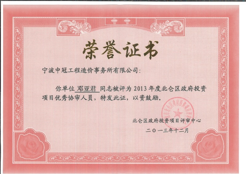 经北仑区评审中心对2013年度协审项目考核结果,我公司邓亚君同志续2011年度,再次被评审中心评为为优秀协审人员。