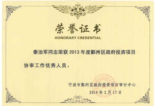 热烈祝贺秦治军同志荣获2013年度鄞州区政府投资项目协审工作优秀人员-中冠新闻-中冠咨询-ob欧宝官网首页中国有限公司