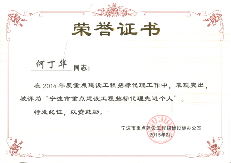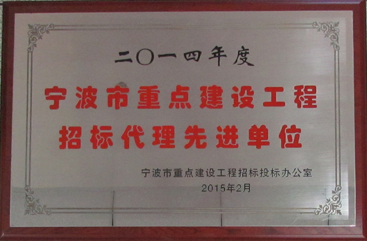 2015年2月喜讯传来,我公司被宁波市重点建设工程招标投标办公室授予“2014年度宁波市重点建设工程招标代理先进单位”的荣誉称号,同时我公司何丁华同志被授予“宁波市重点建设工程招标代理先进个人”荣誉称号。