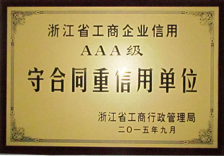 根据《浙江省工商企业信用等级“守合同重信用”单位认定管理办法》,经浙江省工商行政管理局考核,我公司荣获“浙江省工商企业信用AAA级‘守合同重信用’单位”荣誉称号。