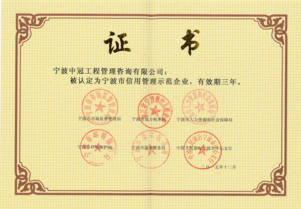 根据宁波市市场监督管理局、宁波市地方税务局、宁波市人力资源和社会保障局、宁波市环境保护局、宁波市国家税务局、中国人民银行宁波市中心支行,近期发布的《关于认定2015年“宁波市信用管理示范企业”的决定》,我公司荣获“宁波市信用管理示范企业”荣誉称号。