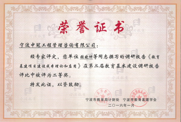 根据宁波市教育局计财处、宁波市教育基建学会,近期发布的《关于公布第二届教育基本建设调研报告评比结果的通知》,我公司张晓坤撰写的调研报告《教育基建项目建设成本理论和应用》在第二届教育基本建设调研报告评比中荣获二等奖