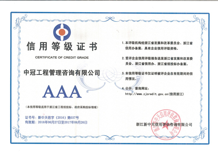 近期经浙江新中天信用评估咨询有限公司的评测,我公司顺利取得适用浙江省工程招标投标、政府采购投标领域“AAA”级信用资格的延续。