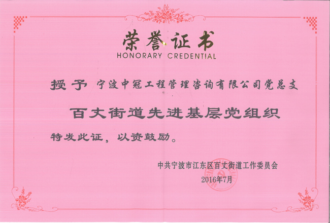 根据中共宁波市江东区百丈街道工作委员会近期发布的《中共宁波市江东区百丈街道党工委关于表彰街道优秀共产党员、优秀党务工作者、先进基层党组织的决定》,我公司党总支被授予“百丈街道先进基层党组织”荣誉称号。