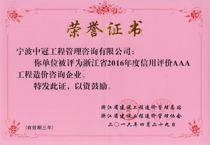 根据浙江省建设工程造价管理总站、浙江省建设工程造价管理协会近期公布的《关于公布浙江省2016年度工程造价咨询企业信用评价结果的通知》,我公司荣获“浙江省2016年度信用评价AAA工程造价咨询企业”荣誉称号,有效期三年。 特此报喜! 办公室2017年1月4日