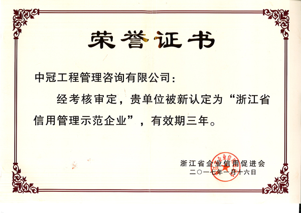 根据浙江省企业信用促进会近期发布的《关于认定2016年度“浙江省信用管理示范企业”的决定》,我公司荣获“浙江省信用管理示范企业”荣誉称号,有效期三年。 特此报喜 办公室2017年3月23日