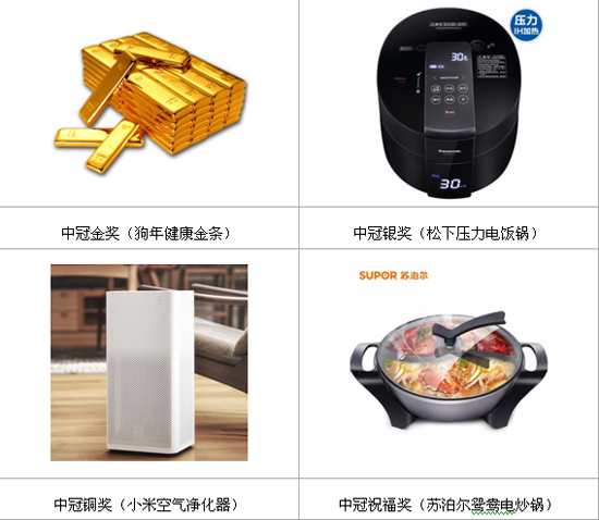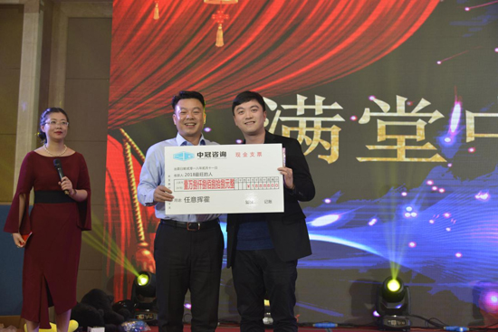 穿插在满堂中冠·酒会中还有激动人心的抽奖活动,公司设置了各类丰富的奖品,大家一边吃着丰盛的晚宴,一边不时接受幸运的眷顾,层层的抽奖环节令人激动不已。整个酒会抽奖环节共设有中冠祝福奖(苏泊尔鸳鸯电炒锅)30名、中冠铜奖(小米空气净化器)12名、中冠银奖(松下压力电饭锅)7名、中冠金奖(狗年健康金条)3名,更有所有人都怦然心动的中冠钻石大奖(18888元现金)1名。